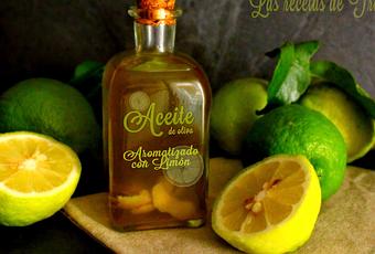 - Colocamos con un colador fino para que no queden restos del limón el aceite resultante y añadimos a la botella de cristal en donde va terminar su maceración.