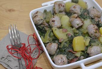 Cuando la butifarra haya cogido color, añadimos las acelgas y las patatas y el medio vasitos de agua de la cocción y removemos para que se mezcle. Dejamos cocinar todo junto unos 5 minutitos en función dorar.