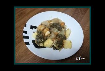 ELABORACION -Lavamos y troceamos muy bien las acelgas-Lavamos, pelamos y troceamos las patatas-Cocinamos las acelgas con patatas en la olla rápida y una vez hechas las escurrimos bien-Picamos finamente el ajo y hacemos un sofrito con esto, las acelgas y las patatas-Sazonamos al gusto con sal y pimienta y salteamos todo bien