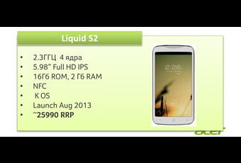 En cuanto a su cámara o hardware multimedia no se tienen datos, además esta información fue proporcionada por GFXBenchmark mediante su portal web. Su presentación se hará en el evento IFA 2013 que se realizará en Berlin, Alemania y la información que se maneja, menciona que el Acer Liquid S2 llegará por primera vez al mercado de Rusia por un precio de 585 euros, pero también estará disponible con en otros países de Europa y Asia.