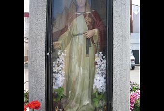 La plaza cuenta con la imagen de Santa Brígida en el centro de la misma, acompañada de numerosos ramos de flores.