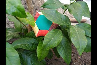 Está escondido entre las hojas del limonero de la casa del pueblo.