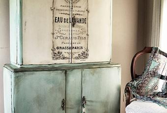 Empecemos por el cuerpo superior. Dos grandes puertas que pintamos en color blanco antiguo y decoramos con la reproducción de una antigua etiqueta de perfumería.
