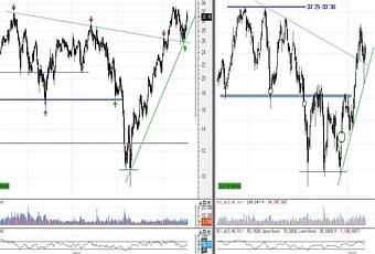 Si nuestra operativa se corresponde con el corto plazo, nos resulta altamente interesante ver cómo la sombra del martillo se apoya perfectamente en la línea de tendencia alcista acelerada (lo podemos ver el gráfico diario de ACS, el situado a la derecha). Esto nos llevaría a pensar que el impulso alcista que dio origen el patrón de triple suelo no ha perdido fuerza y se encuentra en condiciones de continuar su avance.