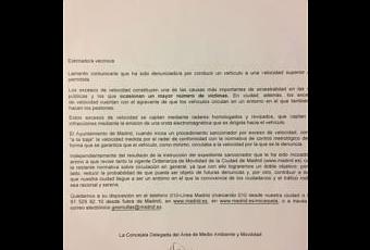 Lamento comunicarle que ha sido denunciado/a por conducir un vehículo a una velocidad superior a la permitida. Los excesos de velocidad constituyen una de las causas más importantes de siniestralidad en las vías públicas y los que ocasionan un mayor número de víctimas. En ciudad, además, los excesos de velocidad cuentan con el agravante de que los vehículos circulan en un entorno en el que también lo hacen los peatones. Estos excesos de velocidad se captan mediante radares homologados y revisados, que captan las infracciones mediante la emisión de una onda electromagnética que es dirigida hacia el vehículo. El Ayuntamiento de Madrid, cuando incoa un procedimiento sancionador por exceso de velocidad, computa "a la baja" la velocidad medida por el radar de conformidad con la normativa de control metrológico de forma que se garantiza que el vehículo, como mínimo, circulaba a la velocidad por la que se le denuncia. Independientemente del resultado de la instrucción del expediente sancionador que le ha sido incoado, le animo a que revise tanto la vigente Ordenanza de Movilidad de la Ciudad de Madrid (www.madrid.es) como la restante normativa sobre circulación en general, ya que con ello lograremos un doble objetivo: por un lado, reducir la probabilidad de que pueda ser objeto de futuras denuncias y, por otro, contribuir a lograr que nuestra ciudad llegue a ser un entorno en el que la convivencia de los ciudadanos y el tráfico rodado sea racional y serena.