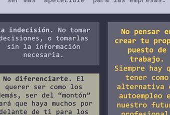 Uno de los errores más usuales que pueden cometer algunas personas, es sentarse a esperar hasta que les resulte un trabajo. Las personas deben entender que nada cae del cielo, para conseguir las cosas se deben hacer sacrificios, en este caso, para poder conseguir un empleo, se debe salir y tocar puertas, repartir hojas de vida, tener maneras diferentes para darse a conocer hasta obtener un trabajo. De lo contrario, será muy difícil lograrlo.No pensar en ser tu propio jefe