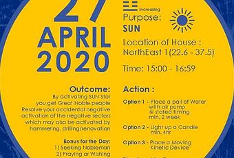 🔸27 Abril Activar SUN.Hora dada por Joey Yap07:30hHora dada por Don Tan:15:00/16:59h Noreste1 (22,6°a 37,5°)Aunque también da la opción de hacerlo a las 07:30, está explicado en su publicación.Colocar1 recipiente de agua en movimiento 2 semanasO1 vela encendida durante 4h mínimo.OAlgo en movimiento, un despertador o Maneki-neku o un péndulo.