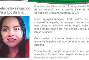 Para cualquier información sobre su paradero, se pone a disposición de la ciudadanía el celular 44 42 04 04 13 o el teléfono de oficina (444) 8124961, así como el número sin costo 01800 75 26 237; también se puede acudir a las instalaciones de la PGJE ubicadas en Eje Vial 100 en la zona Centro de la Capital de San Luis Potosí.