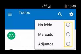 Una vez dentro recurriremos a la esquina superior derecha del entorno en donde encontraremos un icono con forma de rueda dentada (generalmente en color blanco). Al pulsarlo se desplegarán las opciones que son de nuestro interés: No leído, Marcado y Adjuntos.