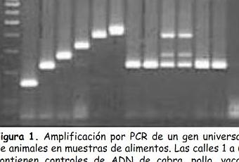 En la siguiente figura se muestra el resultado obtenido al amplificar por PCR un gen universal presente en todas las especies animales. En este ensayo, cada especie genera una banda de amplificación de un tamaño determinado.