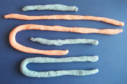 Collares espectacularesPrimero:Materiales: masa coloreada de harina compacta, palo delgado, escarcha, goma, cortador de plástico y cuerda delgada.1.- Modelar cordeles de diferente longitud y de dos colores.