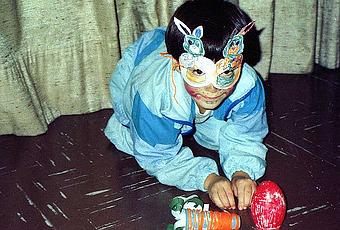 Otra cosa que le encanta hacer a los niños es disfrazarse, y la Pascua presta para esto mismo, hay mucho dentro de lo cual elegir, ya sea con un traje del conejo de pascua para el que se deberá hacer una careta con cartón y crayones, o también vale disfrazarse de un gran huevo de pascua y salir a mostrarse por el barrio con los vecinos. Recomendamos el uso de muchos colores, papeles espejados y brillantina, ya que son muy estimulantes para los más pequeños.