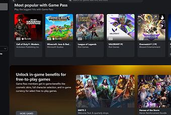 - Explora las pestañas de Inicio o Game Pass para ver la sección de beneficios del juego. Haz clic en “Más juegos” para explorar todos los beneficios del juego.
