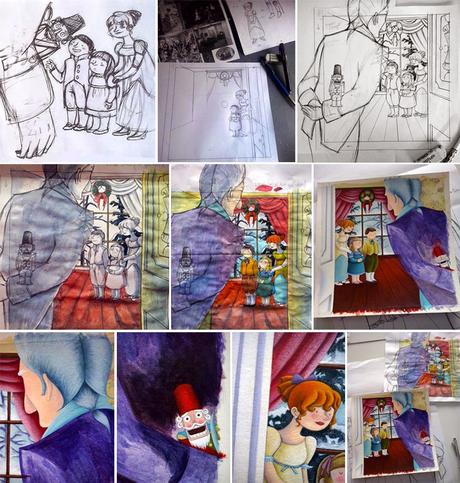 El "making of" muestra los cambios que ha sufrido esta ilustración empezando por el boceto inicial. Rehice el dibujo por completo haciendo un plano más cerrado donde ubicar en perspectiva a los personajes respecto al padrino Drosselmeier que aparece en primer plano en posición de tres cuartos de espalda. Aún así, a la hora de calcar el dibujo, varié ligeramente su tamaño y volteé la ilustración para favorecer el orden de lectura de la composición. También probé, encima de una fotocopia, la valoración de grises y el posterior estudio de color con acuarelas.