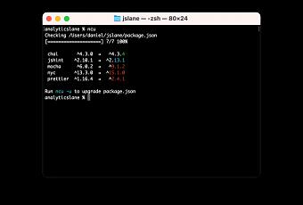Tras la instalación del paquete en nuestro sistema podemos ir a cualquier proyecto y ejecutar el comando ncu. Por ejemplo, podemos descargar el proyecto jslane (código que se puede descargar desde GitHub) para ver los paquetes que requieren actualización.