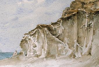 El anterior es una de las primeras pruebas que hice esta semana pasada con la Sennelier. En el cielo se ve la mezcla del azul cerúleo con ocres. El cerúleo es un pigmento que sedimenta y granula también, en todas las marcas. Este pigmento debe ser de calidad, como el de Sennelier, el Rembrandt o el W&N Artist. Los de mala calidad son una pasta cubriente totalmente horrible, capaz de arruinar cualquier trabajo. El de Sennelier es bastante transparente. Me voy a quedar con él. También he utilizado el verde esmeralda de esta marca. Color difícil de usar. Brillante, fuerte y pinturero, sólo es un verde difícil de encajar en la obra. Mezclado, con azul, rojo o sienas, bastante diluido puede dar una frescura que otros verdes no tienen. Pero con mucho cuidado. Para la transparencia de las aguas en acantilados o en aguas quietas, puede ser útil. Tanto como el Turquesa de W&N artist. Caro pero inigualable. Cmo su rojo cadmio oscuro.