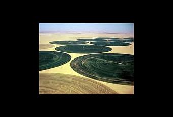 Por medio de pozos artesanales y unas regaderas gigantes de 565 metros han conseguido campos circulares de un diámetro superior al kilómetro (ver foto). Se da la paradoja de que, siendo este país yermo en el 98% de su territorio, cuenta en el sur con cuatro acuíferos subterráneos (el yacimiento de Kufra, Sirt, Morzuk y Hamada), en los que hay 35.000 kilómetros cúbicos de agua potable procedentes de una corriente subterránea del Nilo. De hecho, desde 1980 el Estado libio lleva construyendo un acueducto de 4000 kms, que llevará el agua a través del desierto, con los recursos financieros del propio país.