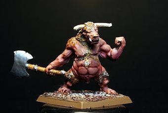 La raza de los minotauros es una raza que hasta la fecha sólo ha quedado Warhammer. En los inicios de Rogue Trader hubo un pequeñísimo intento por parte de Games Workshop de pasarlos al universo de Warhammer 40000 y sacó dos miniaturas en 1987 pero creo que por su bajo éxito dejaron de producirlas muy pronto y desde entonces han desaparecido de Warhammer 40000, no volviéndose a ver. No tengo ninguno de los dos minotauros que salieron en Warhammer 40000 (no me gustaron nada). Probablemente esta fue la primera miniatura de un minotauro que Games Workshop comercializó. Apareció en el Third Citadel Conpemdium de 1985 dentro de la gama de Advanced Dungeons & Dragons. La miniatura es espectacular en tamaño y creo que no hay minotauro mayor de esa época (salvo los actuales de plástico). La miniatura es completamente de metal maciza dividida en dos parte. Por un lado la cabeza y por otro el resto.