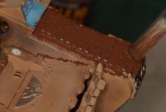 Cuando seque completamente es posible que quede pigmento sin fijar. Si queréis que se fije del todo aplicad otra vez limpia cristales, seguido de otra capa de Medium. Tras esto está acabado y es hora de pegar las orugas al tanque. Luego podéis añadir pigmentos a los bajos para que quede más realístico.