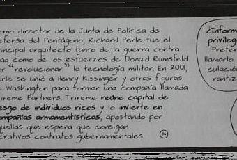 ¿Y por qué tanta muerte? Es precisamente lo que el autor pretende explicar. Como todo buen ensayo, tras un primer contacto con los personajes en el que se delimita el tema y los objetivos de la obra, Andreas aprovecha los primeros capítulos para contextualizar la situación, y para ello se sirve de los antecedentes bélicos de los Estados Unidos, sus últimos doscientos años de historia militar, desde la conquista del Oeste hasta la II Guerra del Golfo. Una vez finalizada la presentación del “currículum de sangre” de la primera potencia mundial, es hora de entrar en materia y responder al subtítulo de la obra: ¿Por qué Estados Unidos está enganchada al militarismo? Creo que todos conocemos la respuesta de antemano: por intereses económicos. Ahora bien, ¿por intereses económicos en beneficio de todos los norteamericanos? No, sólo para una minoría de personas a las que el autor señala sin ningún pudor, con nombre y apellidos, y tras las cuales se encuentran las mayores empresas mundiales y medios de comunicación, que generan el mediático circo del terror que allana el terreno para la guerra.
