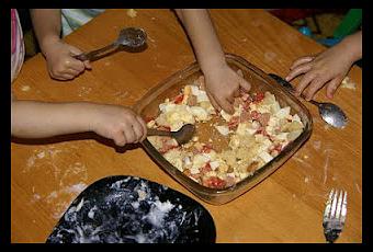 Ahora lo que hago es ponerles una cena para niños en la mesita del salón con sus sillas de plástico. No os preocupéis que mi mesa del salón es una baratunga de Ikea que además heredé de mi hermana. Ayer por ejemplo les troceé una manzana y la rocié con nata montada, se le iban comiendo mientras preparaba el plato principal, una "ensalada" de mortadela (mortadela, dos huevos cocidos, 3 quesitos, medio tomate, trozos de pan y aceite de oliva). Les doy una cucharilla a cada uno, para que vallan practicando y a cenar. Mi flaquito atina bastante bien con la cuchara, creo que se esmera más porque le da asquito mancharse las manos, aunque también come algo con la mano porque atina pero a ese paso terminaría de cenar a media noche, jeje, los otros dos sólo atizan el fondo del plato con la cuchara pero cogen con la otra mano. Si veo alguno rezagado que está más jugando que comiendo le doy yo con el tenedor.