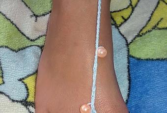 En este hemos realizado un adorno de pie con bolitas. Es muy fácil y divertido para ellos este proyecto. Lo primero de todo, pondremos en el hilo las perlitas que vamos a utilizar, en este caso son tres. tened en cuenta, que la primera perla que pongáis será la ultima en nuestra labor.Comenzamos una cadeneta. cuando hayamos hecho unas diez cadenetas medimos el contorno del dedo, el tamaño depende del grosor del hilo y de lo apretado que lo haga el niño la cadeneta. Si el niño todavía no es habilidoso le cerramos el contorno del dedo. y le engarzamos la primera perlita.Continuamos la cadeneta teniendo en cuenta a la altura que queremos la segunda perlita.Una vez alcanzada esa altura, engarzamos la siguiente perlita. Reanudamos la cadeneta, volviendo a tener en cuenta la altura de la tercera perlita y que quede más o menos sobre el tobillo. Engarzamos la ultima perla, y continuamos haciendo cadenetas, calculando ya el tamaño suficiente para anudarlo en el tobillo ya con una vuelta o con dos.Terminada esa cadeneta, le empezamos una segunda (para poder anudarla en el tobillo) a la altura de la ultima perlita que pusimos. La hacemos del mismo tamaño que la anterior (desde la perlita hasta su terminación)Yo se la remate con varios puntos altos en el ultimo punto de cadeneta.Ya esta y alucirlas..... ellas se hicieron dos, uno para cada pie.