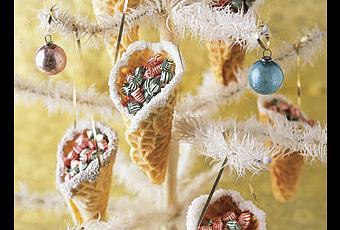 Estos conos están hechos como las creps, y se les ha rellenado de pequeños dulces: bombones, caramelos, almendras... La cocina me gusta, de vez en cuando me meto ensuciándolo todo, pero creo que para esta decoración Navideña, haría lo más sencillo, comprando conos de los que se utilizan en los helados y directamente los llenaría de golosinas.