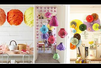 Adornos decorativos para la pared 1.-Este colgante de papel es uno de mis favoritos, solo tenemos que usar el papel y lo doblamos en forma de acordeon, si tu papel no es muy grande puedes unir otras piezas. 2.-3.-4.-Ahora abrimos ese acordeón y lo unimos, usa pegamento blanco o cinta adhesiva. En el centro del acordeón puedes pegar un circulito de papel, un corazón o algún adorno que te guste.