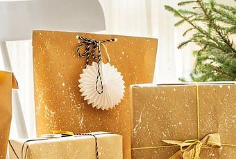 Si te gusta tanto envolver los regalos como comprarlos, puedes personalizar tu papel y darle un look único. Con un pincel salpica pintura blanca, a la tiza o acrílica, sobre papel craft. Deja secar y ya estará listo para envolver. Recuerda el material que necesitarás: pintura, pincel y papel craft. La ideas es usarlos para adornar el pie de árbol o para regalar a tus seres queridos.