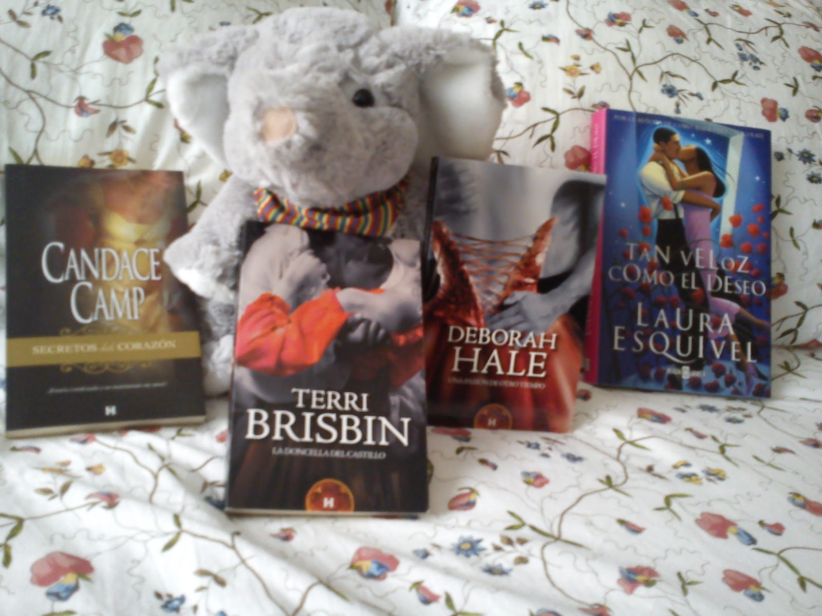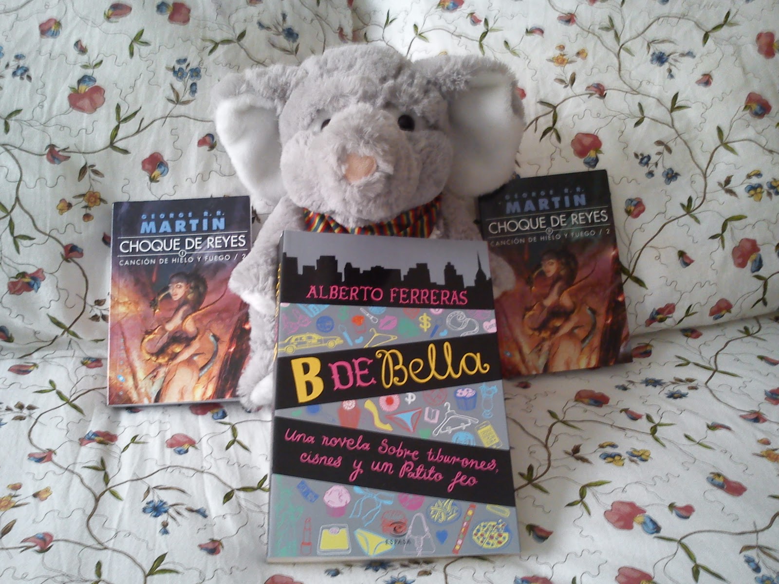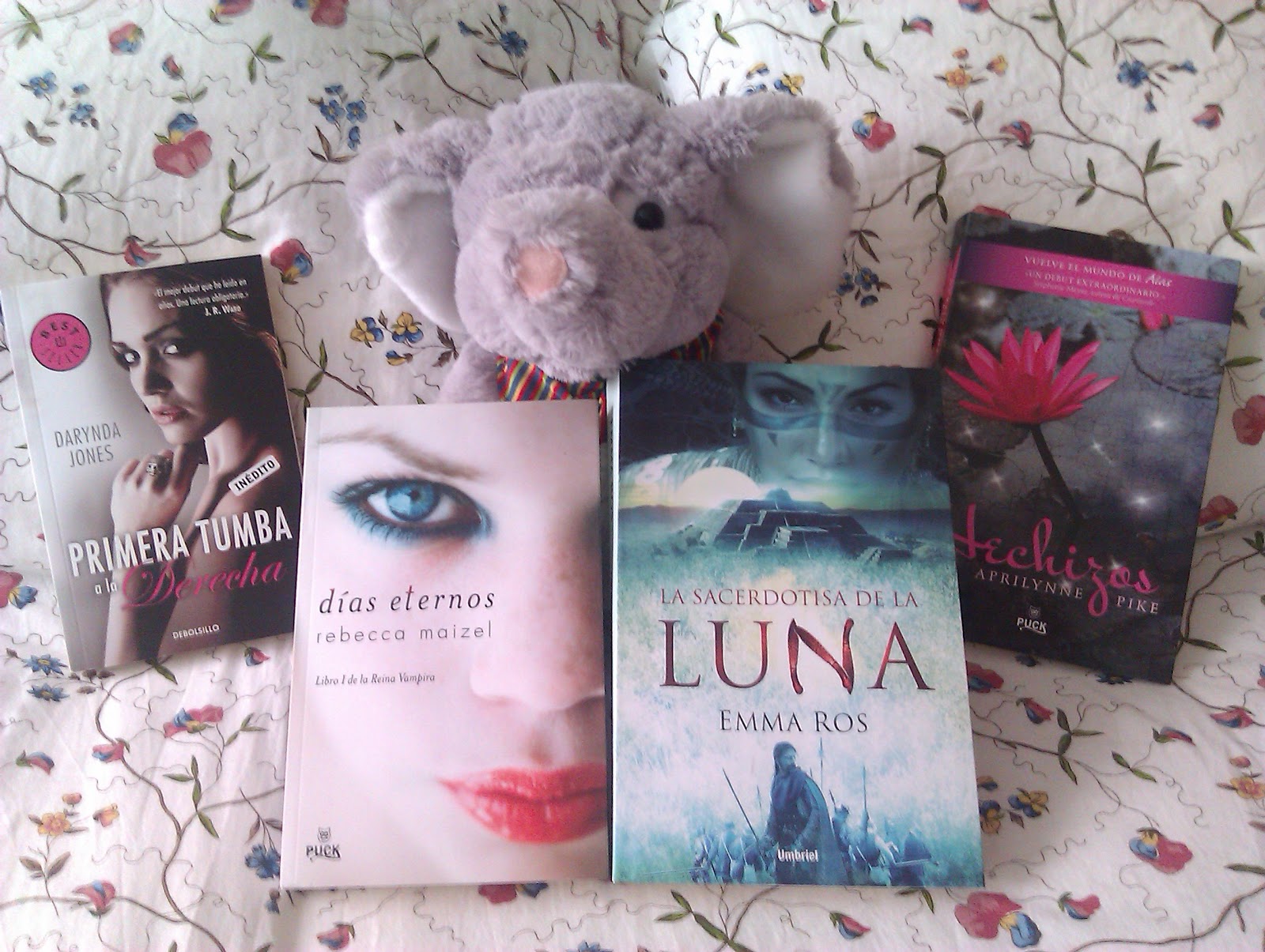 Este mes como podéis ver en las fotos he cambiado de escenario. Me aparecían los libros muy tristes encima de la mesa blanca del salón, que por cierto vosotros no veíais entera. Sólo se veían los libros y un fondo blanco y quedaba un poco lúgubre, triste más bien. En fin, sin enrollarme, he decidido que mi colcha del Ikea era mucho más bonita de fondo y entonces he decidido hacer las fotos encima de ella (una odisea por cierto jeje, por eso de que se hundían, se me torcían para los lados, un caos vamos... También he decidido hacer las fotos con "Tazo" mi elefantito "gustito" porque es tan mono que quería que alguien más que yo lo viese.