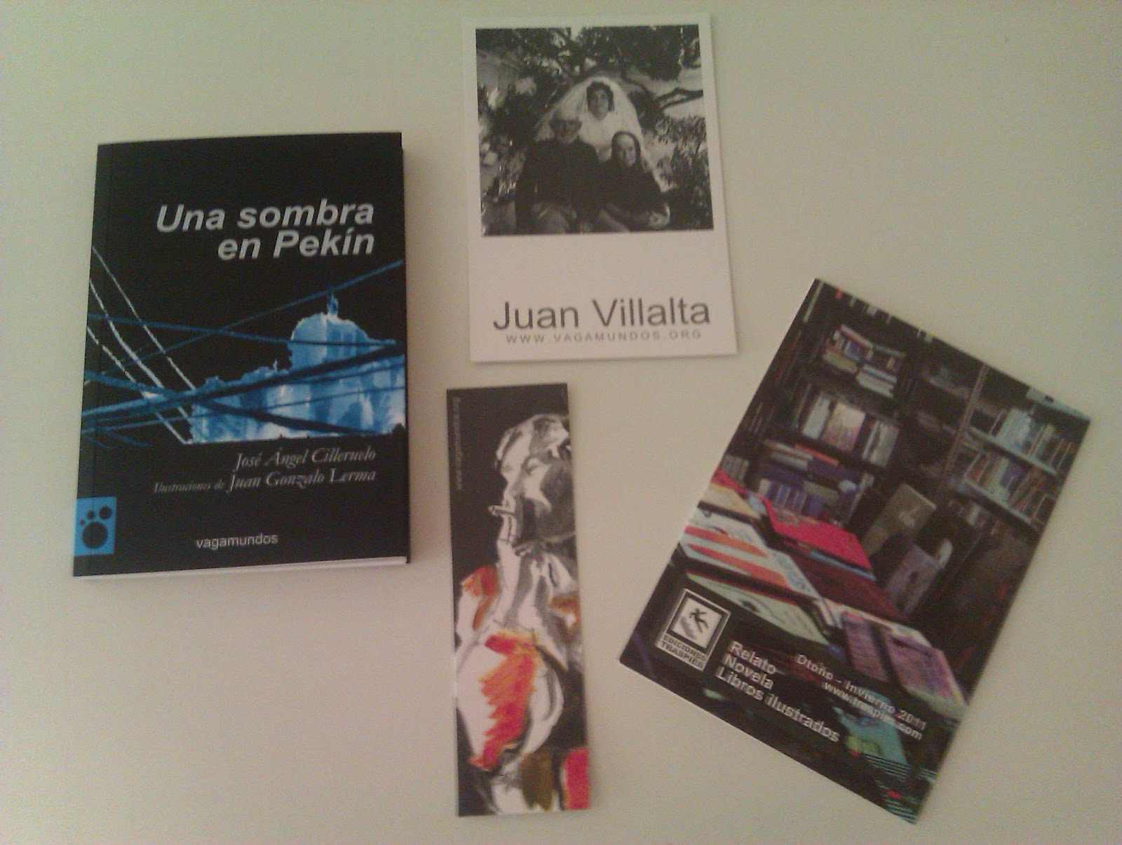 "Una sombra en Pekín" de Jose Ángel Cilleruelo: Este libro lo gané en un sorteo/lectura conjunta que organizaron cinco blogs junto a la editorial Traspiés. El blog con el que lo conseguí yo, fue Libros que voy leyendo, y desde aquí le doy mil gracias porque la verdad me hizo muchísisima ilusión, y disfruté mucho con su lectura. Probablemente entre mañana y el viernes os traiga su reseña ya que el plazo finaliza el día 10 y no quiero que me pille el toro, lo que pasa es que he querido dejar cuajar las impresiones que tuve con el mismo ya que podré entrar en un nuevo sorteo con dicha reseña y quiero que quede bien. Podéis ver que no sólo me enviaron el libro los de la editorial Traspiés, sino que me enviaron un catálogo, un marcapáginas y una postal. Muchas gracias!!