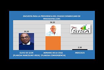 De La Cruz, obtendría el 59,20 % de la preferencia, en representación de Convergencia Periodística, conformado por las agrupaciones Helen Pujols, Juan Andújar, Adoprocom y Vieja Guardia de la Comunicación. El segundo lugar, con un 39.50, correspondería al Movimiento Marcelino Vega, que postula a Olivo De León, actual presidente del gremio por dos ocasiones seguidas y que aspira a una tercera reelección. Respondiendo a la pregunta, ¿Qué candidato ganará las elecciones para el Colegio Dominicano de Periodistas (CDP)? Los 613 encuestados respondieron de la manera siguiente: La empresa SISA GROUP es presidida por el sociólogo chileno Larry Webster y trabaja mediciones en la República Dominicana desde el año 2009. La consulta se realizó los días 17 y 18 de agosto de 2017. El margen de confianza es de 97 % y el estimado de error es de más o menos el 3.0 %. Editado en Neiba, Cabecera de la Provincia Bahoruco, República Dominicana. Contacto: [email protected]