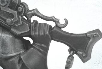 La de ayer por el contrario, casi seguro,es algo de W40K o alguno de sus spin-offs, ya que se claramente lo que parece ser una maza de energía o algo muy parecido.Las posibilidades de que no sea de W40K y sea de AoS son muy pocas, pero tampoco pondría la mano en el fuego por un descarte de plano, la verdad. La mano que la empuña no se ve con claridad,pero parece un guantelete.