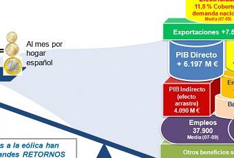 En 2009, el sector eólico continuó ahorrándole dinero a la economía española, según el estudio. El ahorro logrado por la sustitución de importaciones de combustibles fósiles ascendió a 1.541 millones de euros. Asimismo, se ahorraron 270 millones como consecuencia de las emisiones de gases de efecto invernadero evitadas. Además, el sector exportó por valor de 2.104 millones el pasado año, aportó 213 millones a la balanza fiscal e invirtió 156 millones en I+D+i.
