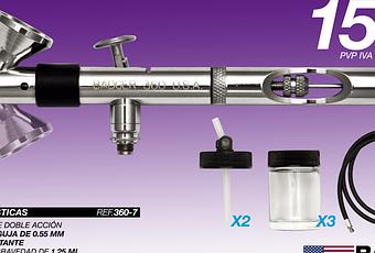 Aerógrafo de doble acción con mezcla interna. Es un aerógrafo que ofrece un manejo de alta precisión. Es capaz de realizar una alimentación por gravedad o por succión, ya que se trata de dos aerógrafos en uno por una rotación de 360º