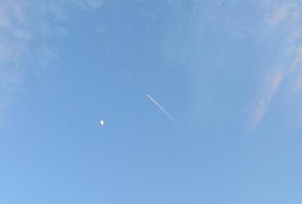 La luna, desde aquí, se ve pequeñita . Enseguida rectifico este pensamiento. Los pequeños somos nosotros. En ese momento, pasa un avión para fastidiarme la foto. Pienso en lo grande que es .