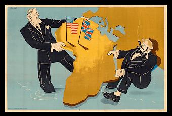 Esta poderosa imagen nos muestra al expresidente de los Estados Unidos, Franklin D. Roosevelt y al exprimer ministro de Reino Unido, Wiston Churchill, en un tira y afloja sobre África. Fue creada por el ilustrador Jean Fort en 1941 para la PAF (Propaganda-Abteilung Frankreich), la unidad de propaganda alemana en la Francia ocupada. El cartel fue diseñado para inflamar la sensibilidad patriótica francesa y el resentimiento después de la invasión aliada de África del Norte -por entonces bajo dominio galo- al comienzo de la operación Antorcha...