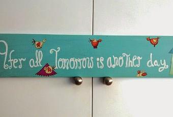 Cartelito decorado en azul mar claro con letras en color blanco. Como dice: "después de todo...mañana será otro dia" de una de mis pelis..."Lo que el vieno se llevó". Decorado con unas aves para darle un toque de color vivo.