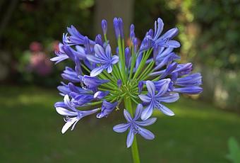 Los agapantos vegetan a expensas de una maraña de raíces carnosas. Sus hojas, perennes en esta especie y caducas en otras, son largas y estrechas, caídas, con las puntas redondeadas y de color verde oscuro brillante. En verano, los altos báculos que portarán las flores emergen de entre la densa vegetación para abrir, a los pocos días, las amplias esferas de flores. Éstas suelen ser de un discreto tono lila y, con menor frecuencia, blanco. Tiene, además, un período de floración largo, con lo que no es difícil disfrutar de sus flores hasta bien entrado el otoño, siempre que la climatología permanezca a niveles aceptables de calor.