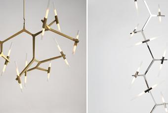Agnes Chandelier es un sistema modular de piezas metálicas con luces de cristal tubulares diseñado por Roll & Hill del Estudio