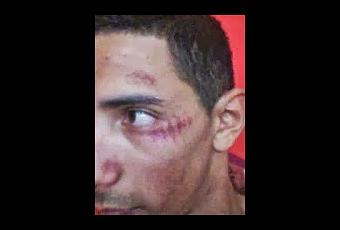 agredido por otro del equipo contrario. Las marcas en su rostro reflejan la gravedad del asunto y