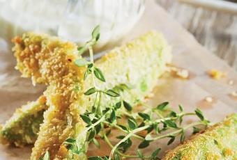 3. Enharina las tiras de aguacate, pásalas por el huevo y empanízalas con el pan molido. Fríelas en aceite caliente hasta que estén ligeramente doradas.