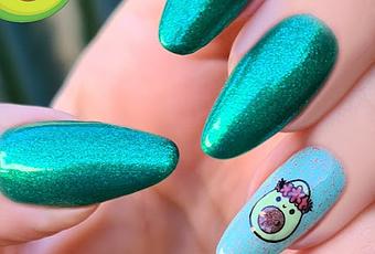 La he titulado "Aguacate tropical" porque nuestro aguacate (es una chica) tiene una corona de flores. Por eso me pegaba para una manicura veraniega. Pero vamos, de verano seguimos (al menos por aquí), así que ni tan mal ha venido 😜.