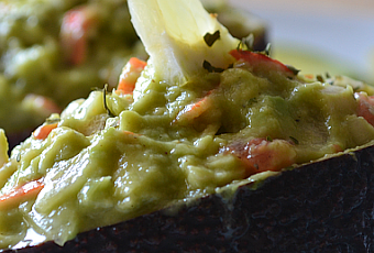 Picamos el tomate, la cebolla y los palitos de cangrejo en trozos pequeños y los mezclamos con la carne del aguacate que habremos machacado, añadimos la sal, la pimienta negra molida, el aceite de oliva y mas zumo de limón.