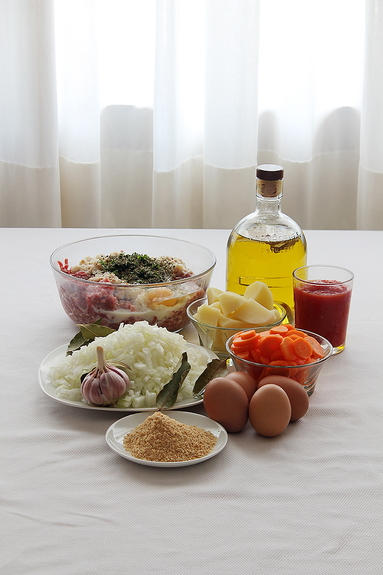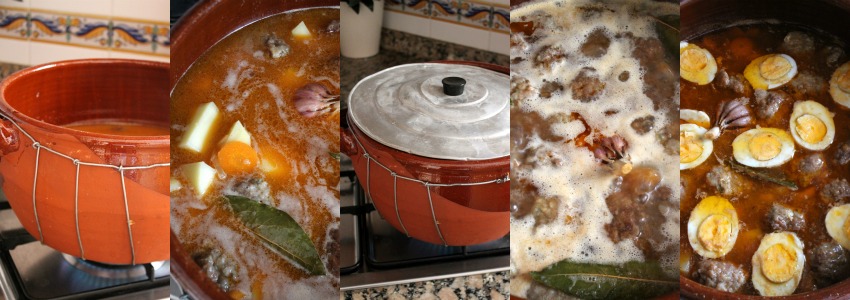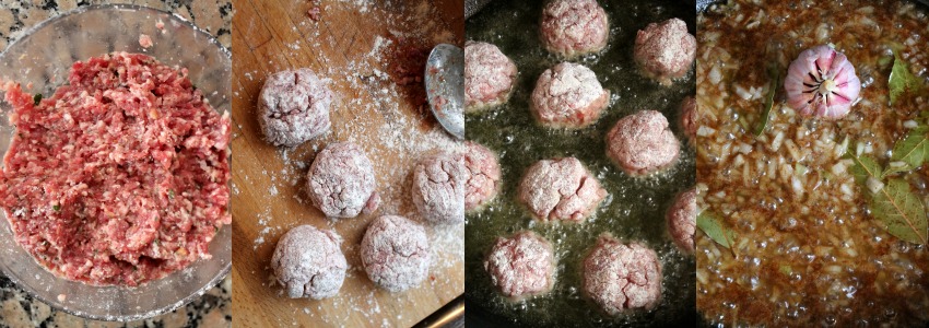 Empezamos preparando las albóndigas. En un bol grande añadimos todos los ingredientes de las albóndigas y mezclamos con la mano hasta que se integren bien los ingredientes. Damos forma a las albóndigas y las enharinamos. En una sartén grande con abundante aceite de oliva freímos las albóndigas en tandas a fuego medio. No lo hagáis a fuego fuerte porque la harina que se quede en el aceite se quemará y después no podremos reutilizar el aceite, que es lo que pretendemos. Una vez fritas las pasamos a una olla de barro y las reservamos.