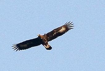 Aguila real Aquila Crysaetos Golden eagleEl adulto me sobrevuela desde bastante cerca, supongo curioseando, y el joven lo hace algo mas alejado, es el momento en que obtengo la siguiente instantánea: