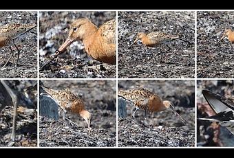 En una playa cerca de Seyðisfjörður, al Este de Islandia, observé varias Agujas colinegras (Limosa limosa ) en plumaje reproductivo. Se encontraban activamente alimentándose en un sustrato intermareal con alta carga de detritos, buscando pequeños invertebrados como anélidos y moluscos. El comportamiento de parada migratoria era evidente: sondeos constantes con el pico recto parcialmente sumergido y desplazamientos cortos en pequeños grupos.