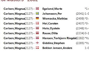 1) Carlsen, Magnus (2127)-Johansson, Per (2041); Troll Masters Gausdal (2) 5-1-2002 – 1-0 en 48 jugadas.-