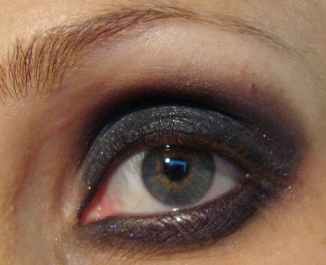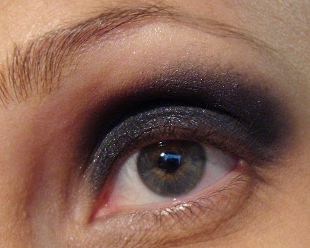 Trazo una linea negra en las pestañas superiores con la ayuda de un lápiz y difumino. Esto le aporta intensidad.En las pestañas inferiores, trazo con cuidado un poco de sombra negra en toda la linea y difumino.Luego relleno por dentro con lápiz negro.En el hueso de la ceja, aporto luminosidad con la ayuda de una sombra blanca nacarada.
