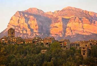 El "skyline" de Ainsa, formado por la torre de la iglesia y los tejados de las casas de piedra, se recorta contra la Peña Montañesa, que se encuentra a su espalda, en un atardecer dorado ofreciéndonos todo un espectáculo. Es una villa medieval situada en el Alto Pirineo de Huesca, cuyo casco histórico está declarado Conjunto Histórico-Artístico desde 1965 y actualmente es un centro turístico de relevancia, por lo cual ha sido declarada capital de Turismo Rural 2018.